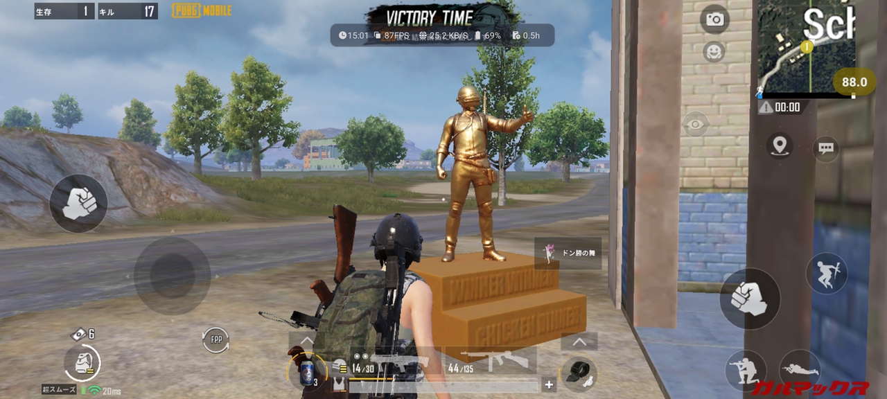 ▼フレームレート重視だと解像度がHDクラスとなるものの、個人的には非常に快適なプレイができたのでドン勝も全然狙えました。17キル気持ちよかったです。やっぱり一等賞は嬉しい。↓