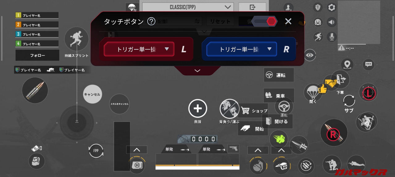普通のスマホで4本指操作する場合、画面上に4本の指が被るので視界がかなり狭くなっているはず。LRタッチボタンを活用することで視界が広がり視認性がグッと向上します。つまり有利なプレイ環境が整えられるんです。