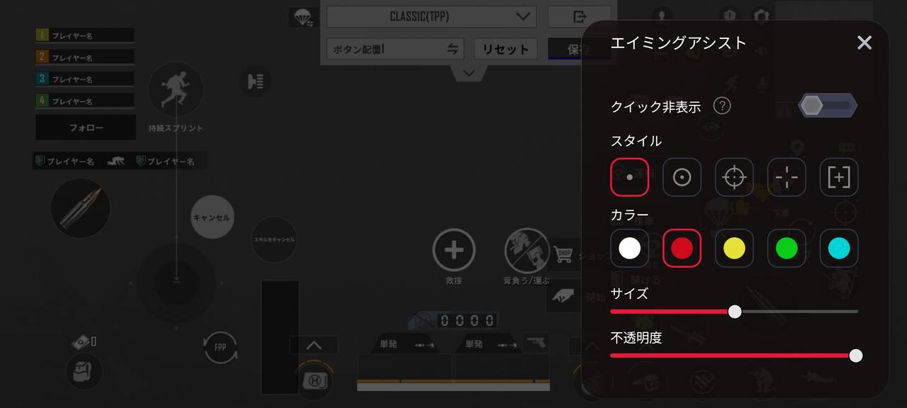 ▼モード名はエイミングアシスト。なかなか香ばしい名称ですが、レティクルのスタイルやカラーの設定だけでなく、サイズや不透明度まで変更できるので、ゲーミングモニターの同等機能よりも柔軟性がめっちゃ高いです。↓