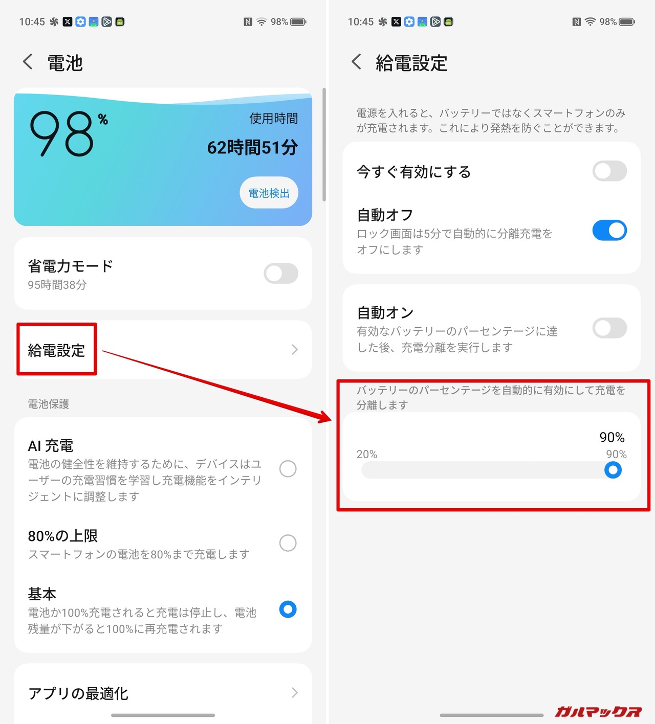 ▼細かい設定は本体設定の「電池」→「給電設定」から行えます。↓