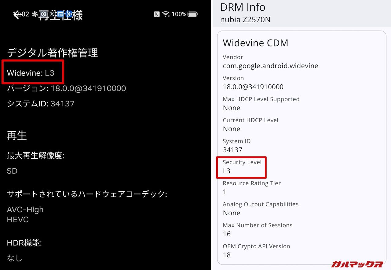 NetflixやAmazonプライム・ビデオなどを高画質で視聴するためにはWidevineがL1に対応している必要があります。確認したところ残念ながらWidevine L3でした。