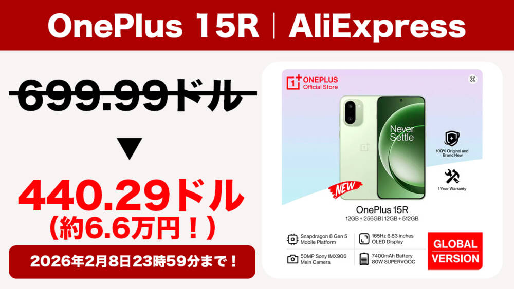 最新のSnapdragon 8 Gen 5を積み込み、超大容量の7,400mAhバッテリーを搭載する「OnePlus 15R」が、なんとクーポン適用で440.29ドル(約6.6万円)になってます!