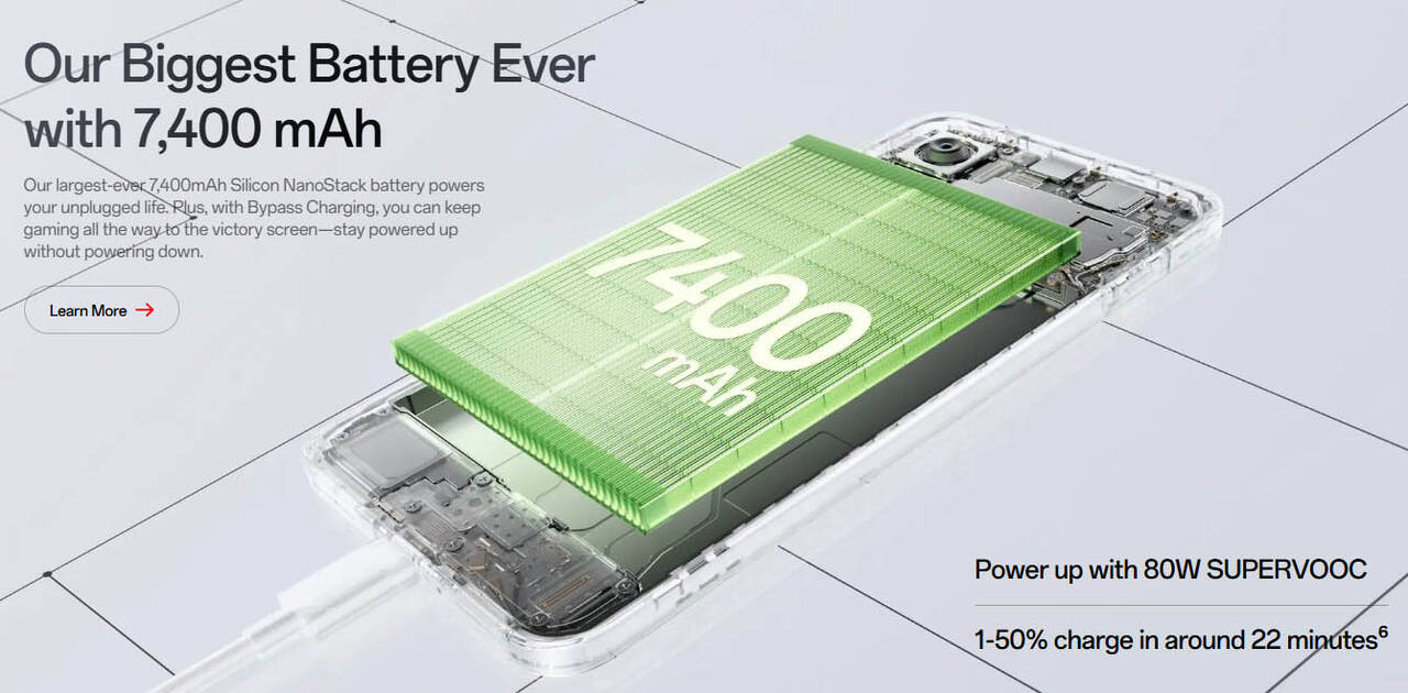 ▼バッテリー容量は7400mAhと大容量。有線充電は80W(SUPERVOOC)に対応しています。22分で50%の充電が可能とのことです。↓