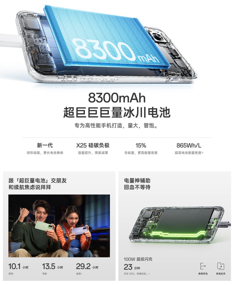 ▼バッテリー容量は8300mAh。100W(SUPERVOOC)、55W(PPS)、44W(UFCS)の急速充電に対応しています。↓