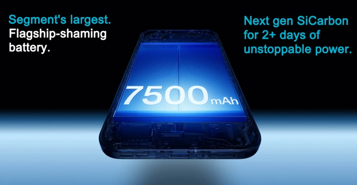 ▼バッテリー容量は7500mAhと大容量!スマホの平均5000mAhの1.5倍ほどの大容量っぷり。通常使用において2日超えの電池持ちを謳います。↓
