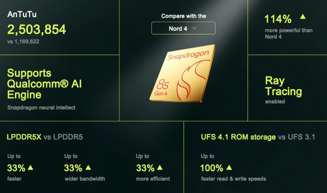 ▼ SoCはSnapdragon 8s Gen 4を搭載。AnTuTu公称値は250万点超えの優秀な処理性能です。メモリもLPDDR5X、ストレージ規格ではUFS4.1採用と完全無欠なチョイス。動作の安定性、ファイル読書速度やアプリの読み込みの速さもハイエンドのそれです。↓