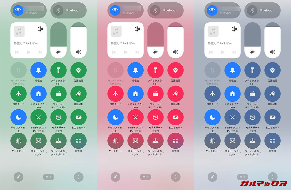 OPPOは以前から透明感のあるUIを一部に採用しており、コントロールセンターも背景の色がボタンに反映されるようになっているんですが…これが非常に見にくいです。アイコンの視認性が低下しますし、チカチカして見にくいですね。