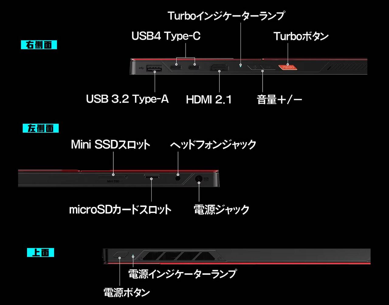 | インターフェース | Type-C(USB4)×2 Type-A(USB3.2)×1 HDMI 2.1(4K/144Hz対応)×1 MicroSDスロット(最大2TB) MiniSSDスロット 電源ジャック |