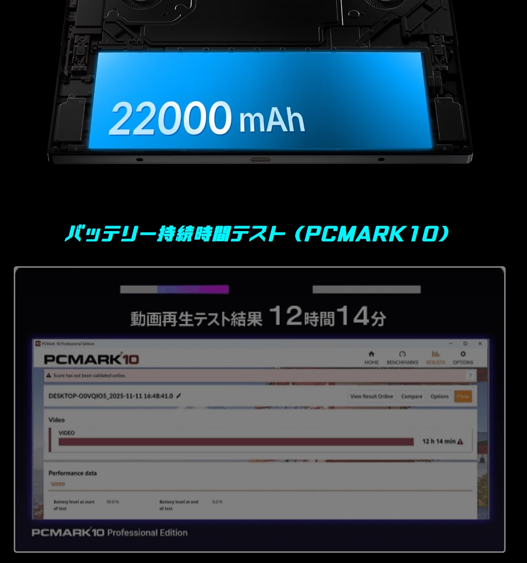 ▼バッテリー容量は85.58Wh(22000mAh)と大容量!PCMarkのバッテリーテストは半日超えの12時間14分と高水準!↓