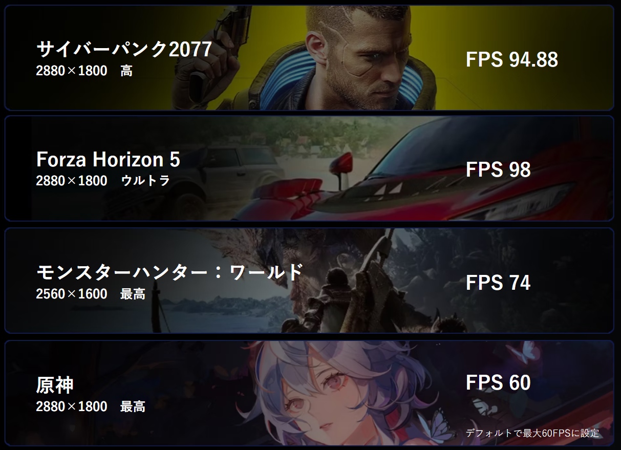 ▼ゲームにおいては重量級となるサイバーパンクでも高プリセット画質で平均94FPS。モンハンのワールド(ワイルズではない)も最高画質で74FPSとなっています。↓