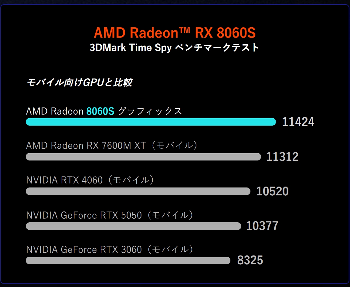 ▼生成AIだけでなくゲーミング性能もバツグンで、モバイル向けのグラボとしては最高レベル。モバイル版のRTX5050を上回ります。↓