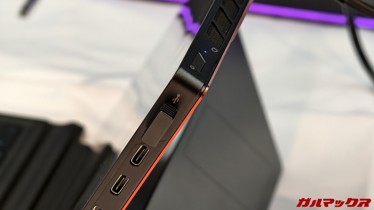 ▼側面はこんな感じで充実!USBのA端子が1つなのはちと不足気味な感じですが、HDMI端子やType-C端子が2つあるのは好印象。新企画のMiniSSDも対応。指紋認証センサーもバッチリ抑えています。↓