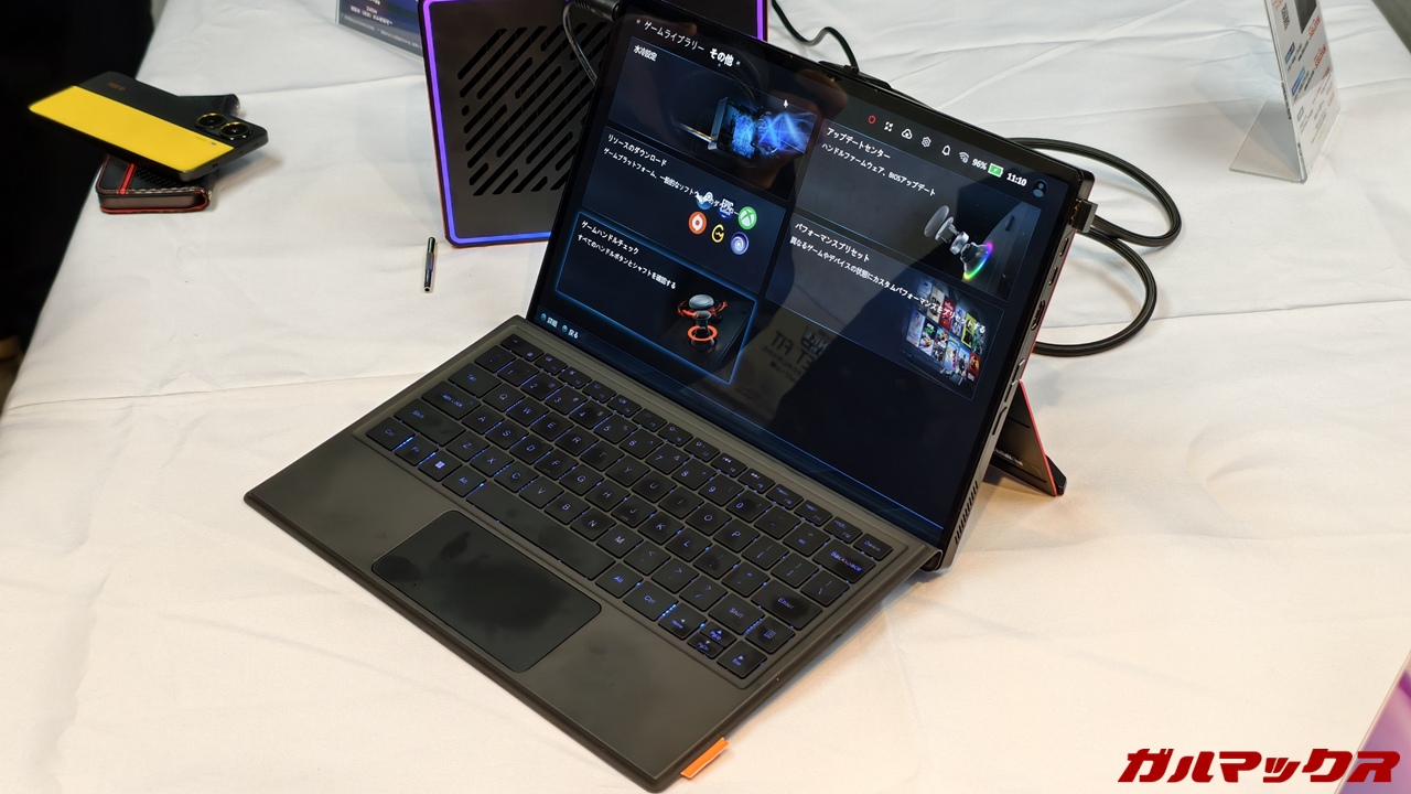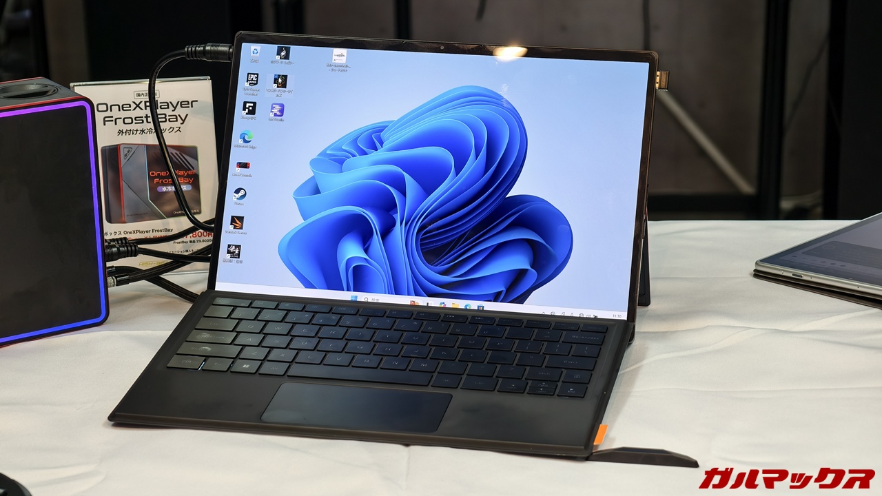 ▼OneXPlayer Super XはタブレットタイプのWindowsパソコン。キーボードは着脱式で、背面にキックスタンドを備えます。↓