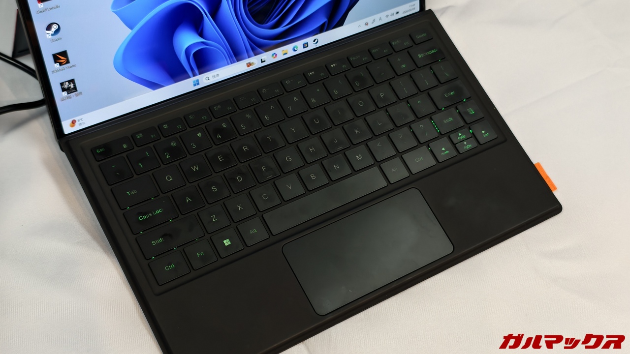 ▼キーボードは結構薄型ですが、実機を触った感じはパチパチ感の強めなタイプ。チープさは感じませんでした。タッチパッドもデカめで、かつ押し込んでのクリックにも対応。↓