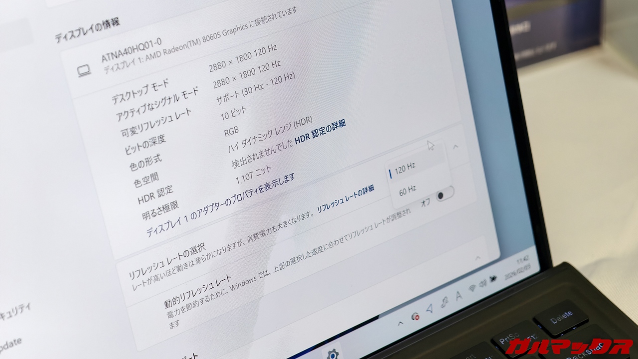 ▼高解像度で文字のくっきり感もバッチリでした。リフレッシュレートは最大120Hzと60Hzの2つのみの固定式でした。↓