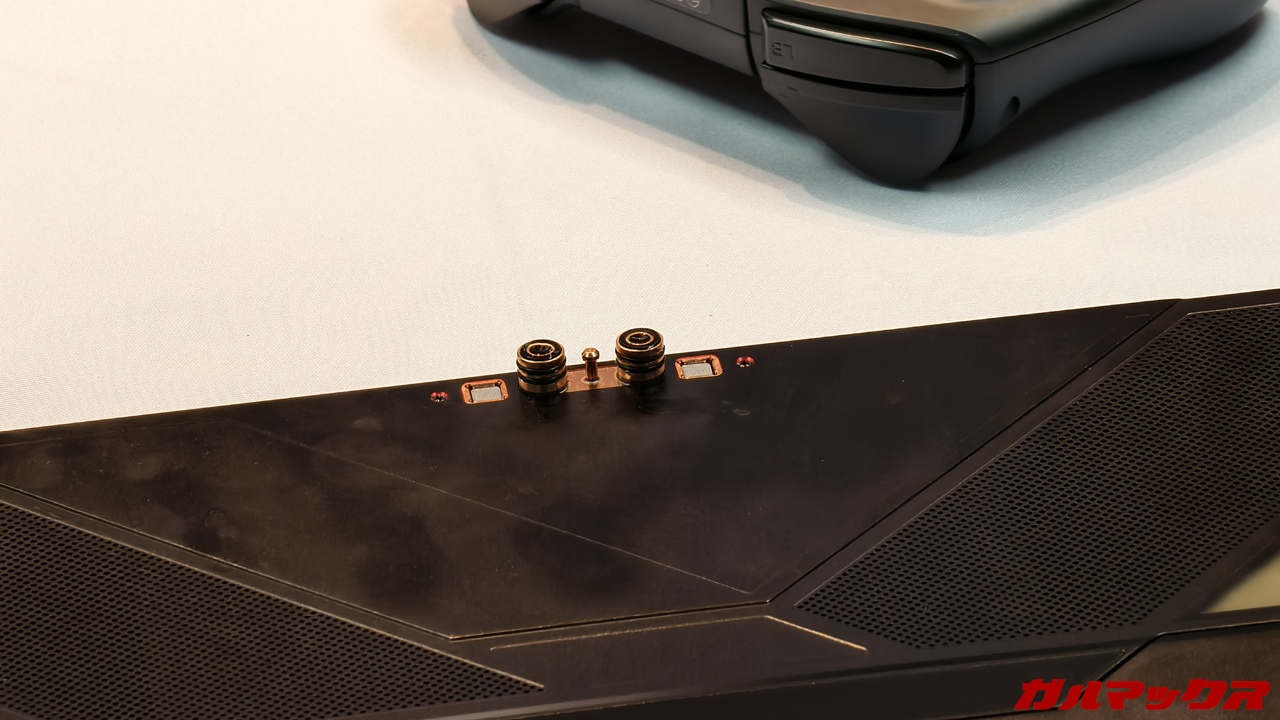 ▼水冷対応モデルだと本体背面の上部に水冷用の端子がついています。漏れ防止の仕組みの兼ね合いかそれなりに出っ張りはあるんで持ち運びんときは嵩張りそう。↓