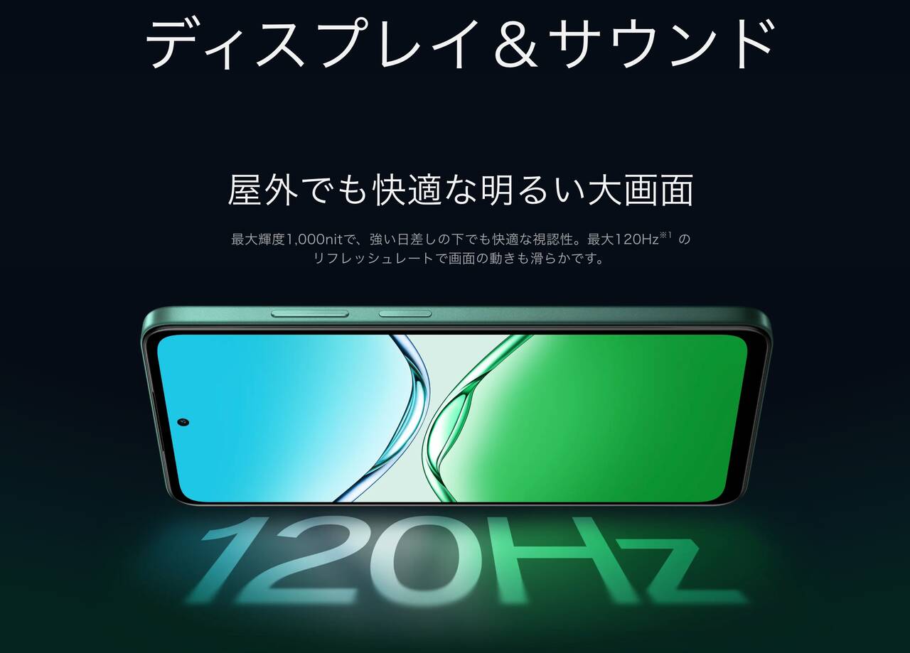 ディスプレイは6.7インチ!解像度はエントリーモデルらしく1,604×720のHD解像度なんですけど、高リフレッシュレート(滑らか表示)は120Hzに対応!これは嬉しい!