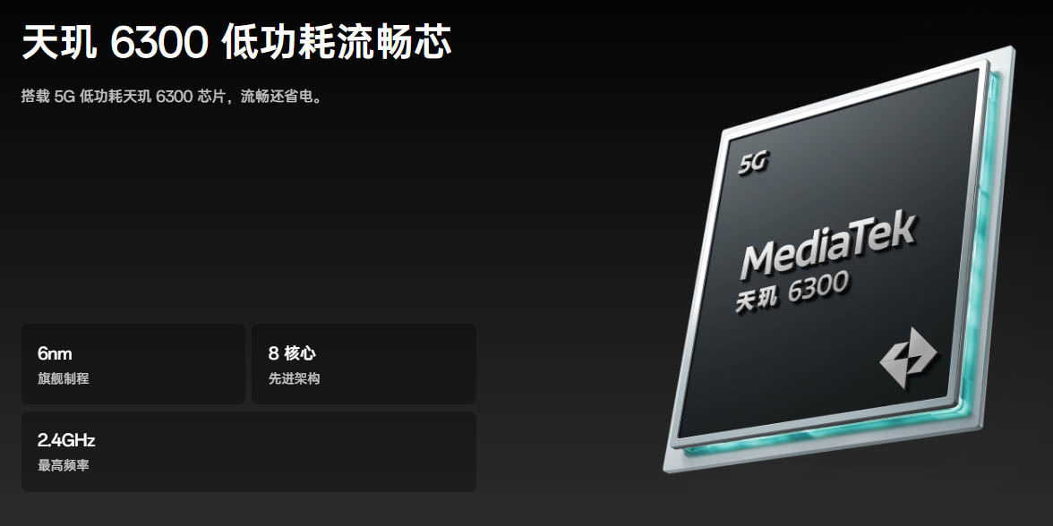 ▼SoCにはDimensity 6300を搭載。AnTuTuスコア(v10)は40万点程度のSoCで、軽作業やシングルタスク程度であれば行える性能があります。↓