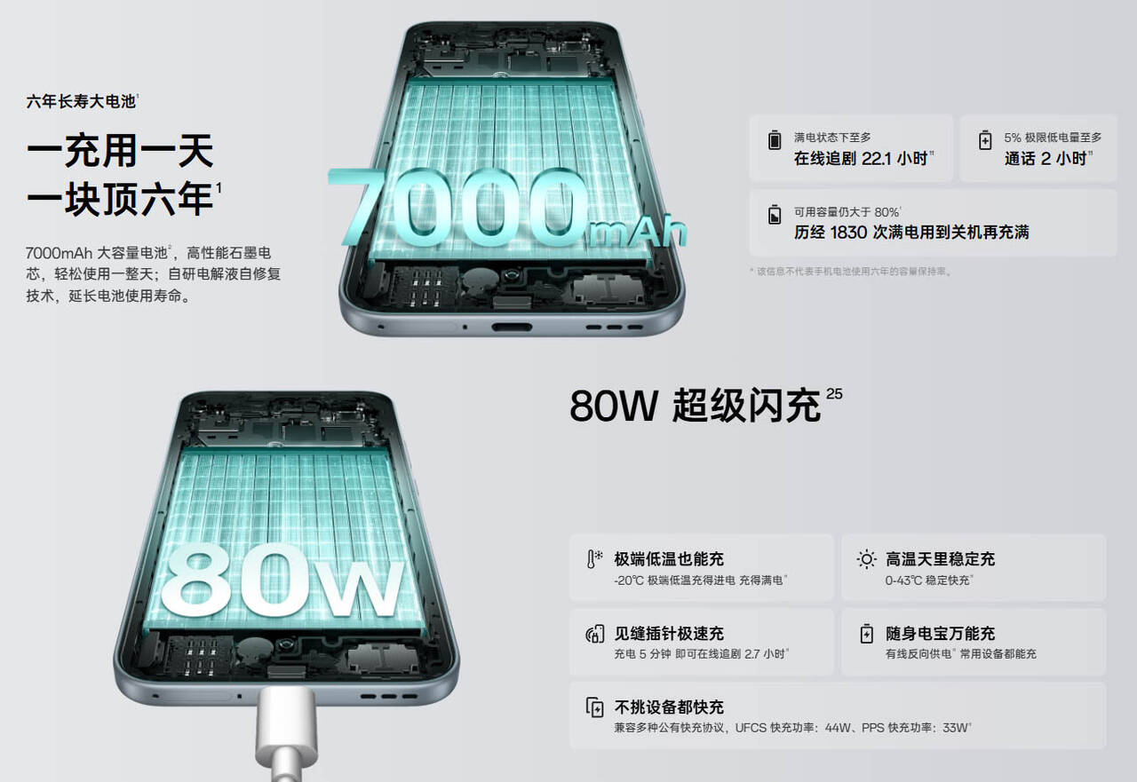 80W(SUPERVOOC)の独自規格のほか、汎用規格でも高速な充電が可能です。