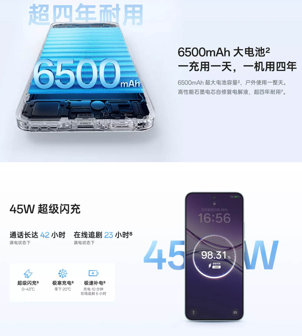 ▼バッテリー容量は6500mAh。45W(SUPERVOOC)の急速充電に対応しています。↓