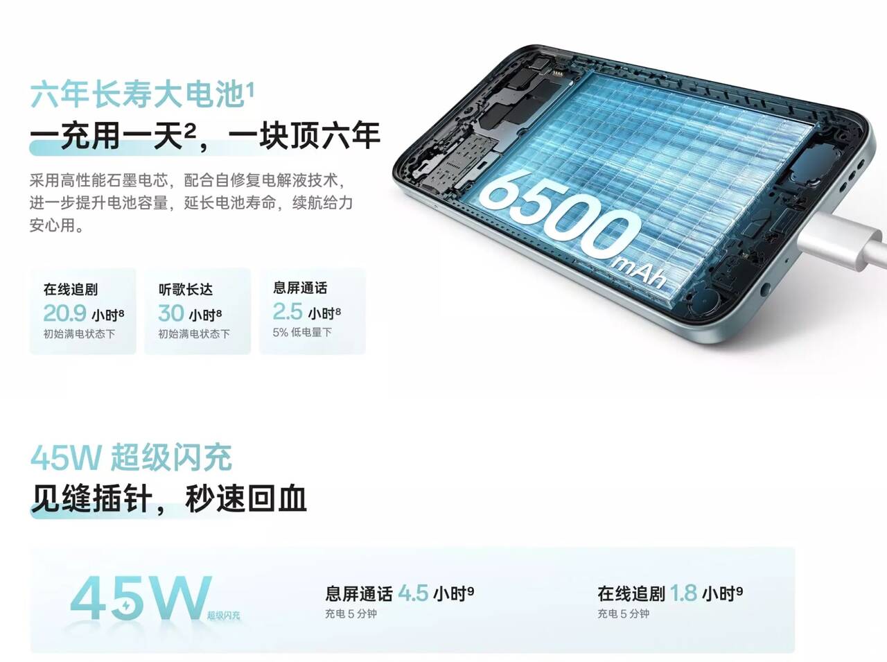▼バッテリーは6,500mAhで45W充電にも対応します。↓