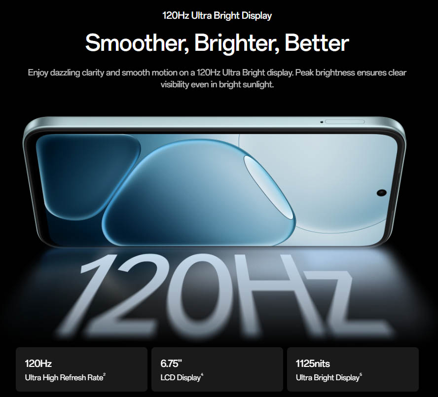 ▼ディスプレイは6.75インチの液晶で、解像度は1570×720のHD解像度なのでドットの荒さが目立つでしょう。リフレッシュレートは最大120Hzに対応しているので滑らかなスクロールが期待できますが…SoC性能がついてこれるのかは不明です。↓