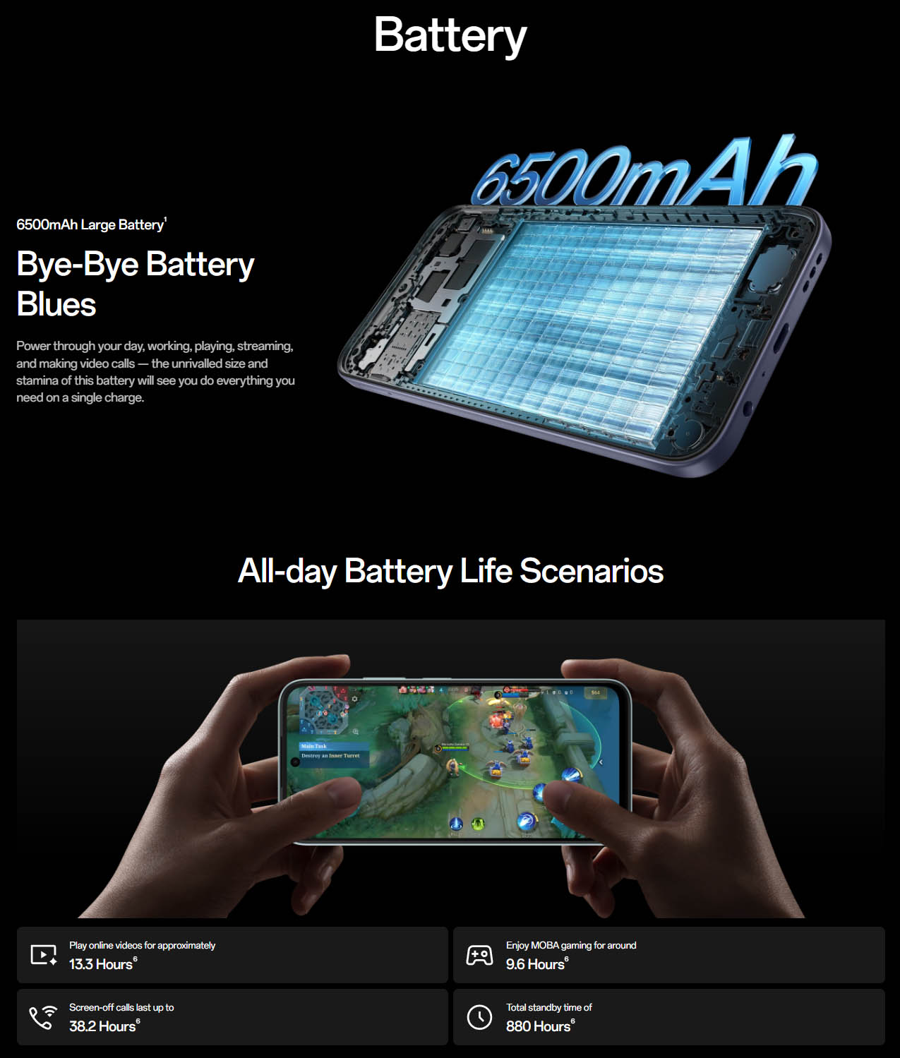 ▼バッテリー容量は6500mAh。充電速度は非公表です。急速充電には非対応とのことです。↓