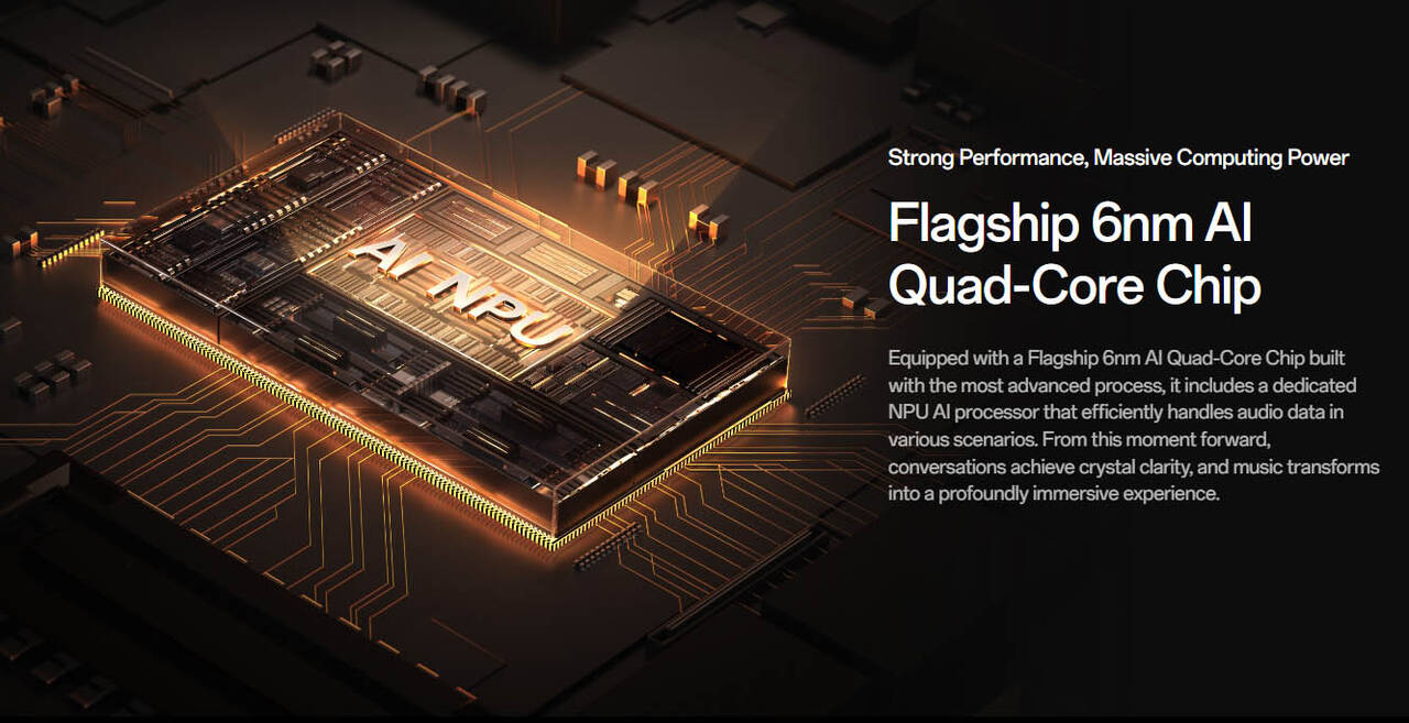▼本体には6nmプロセスで製造されたNPUチップを内蔵。オーディオ処理や会話のノイズ消去などをNPUが行うことで、より優れたサウンド体験が可能です。↓