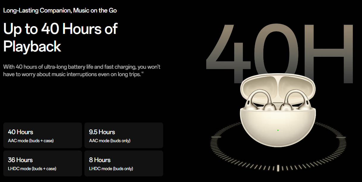 ▼バッテリー容量はイヤホン単体で58mAh、ケースが530mAhです。AACでの単体連続再生時間は9.5時間、ケース込みで40時間。LHDC 5.0での単体連続再生時間は8時間、ケース込みで36時間。↓