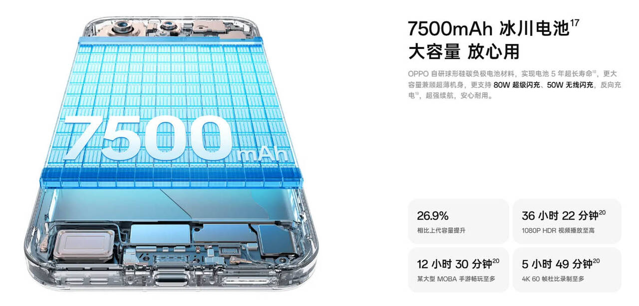 ▼バッテリー容量は7500mAh。独自規格の80W(SUPERVOOC)のほか、55W(PPS)や44W(UFCS)の汎用規格でも急速充電が可能。↓