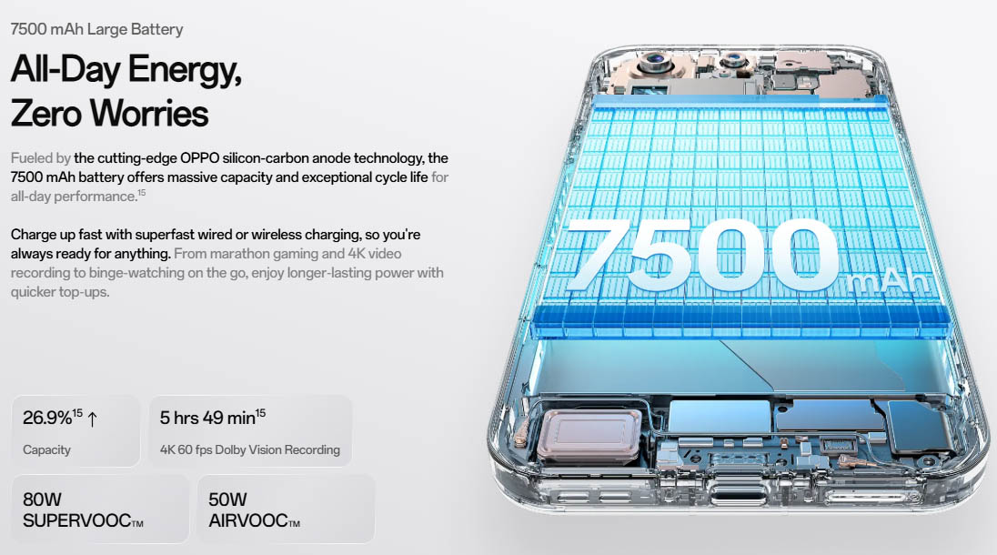 | バッテリー | 7500mAh 有線充電:80W(SUPERVOOC) ワイヤレス充電:50W |