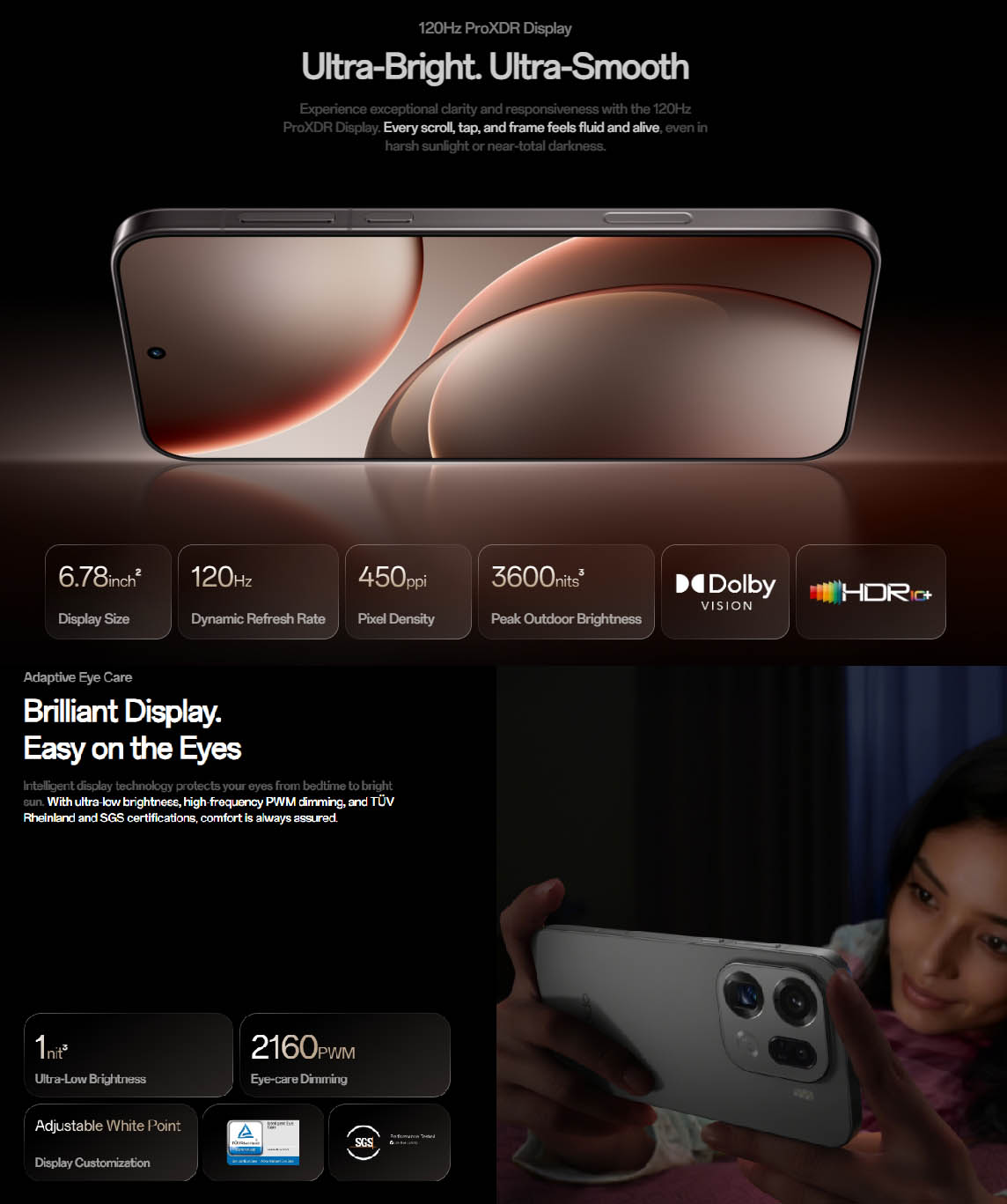 ▼SoCにはDimensity 9500を搭載。メモリ(LPDDR5X)は16GB、ストレージ(UFS 4.1)は512GB。AnTuTuスコア(v11)は350万点以上が期待できるSoCで、普段遣いはストレスフリーで、最重量級ゲームでも高画質で楽しめる性能があります。↓