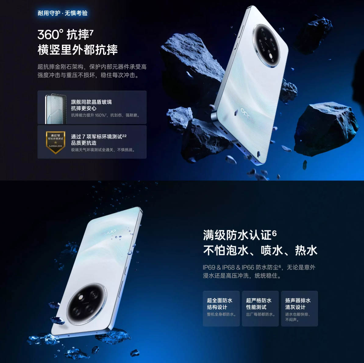 ▼IP66/68/69のトリプル防水防塵に加え、中国軍用規格のGJB150A-2009(アメリカのMIL-STD-810F相当)の28項目のうち、7項目(耐衝撃、高温、低温、砂塵、塩水噴霧、氷雨、雨)満たすレベルの耐久性があるとのこと。↓