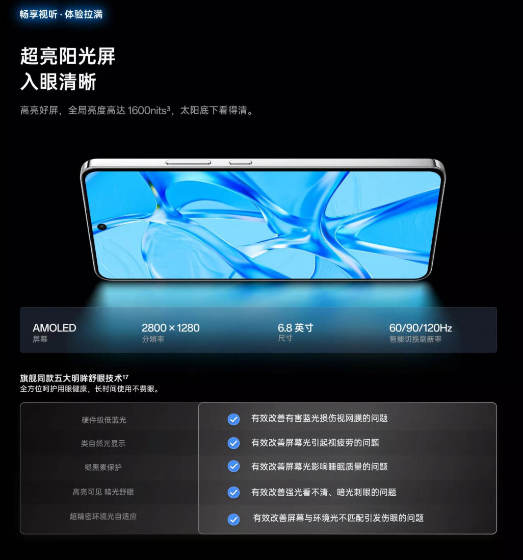 ▼ディスプレイは6.8インチの有機EL。解像度は2800×1280で、リフレッシュレートは120Hzに対応しています。スクリーン光を調整して、目のダメージを抑えるとのこと。