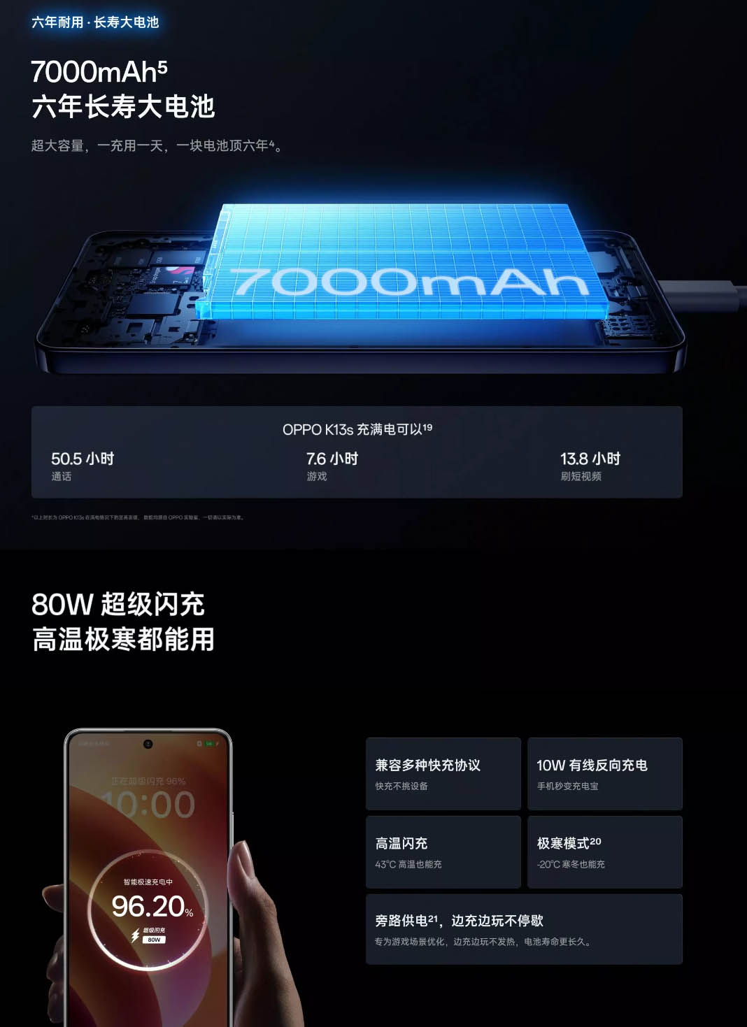 ▼バッテリー容量は7000mAh。急速充電は80W(SUPERVOOC)、4W(UFCS)、33W(PPS)などに対応。13.8時間の連続ショート動画再生や、7.6時間の連続ゲームプレイが可能とのこと。10Wの逆充電にも対応しています。↓