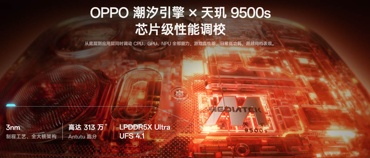 ▼SoCにはDimensity 9500s(12コア版)を搭載。AnTuTuスコア(v11)の公称値は313万です。最重量級のゲームも十分楽しめる性能があります。↓