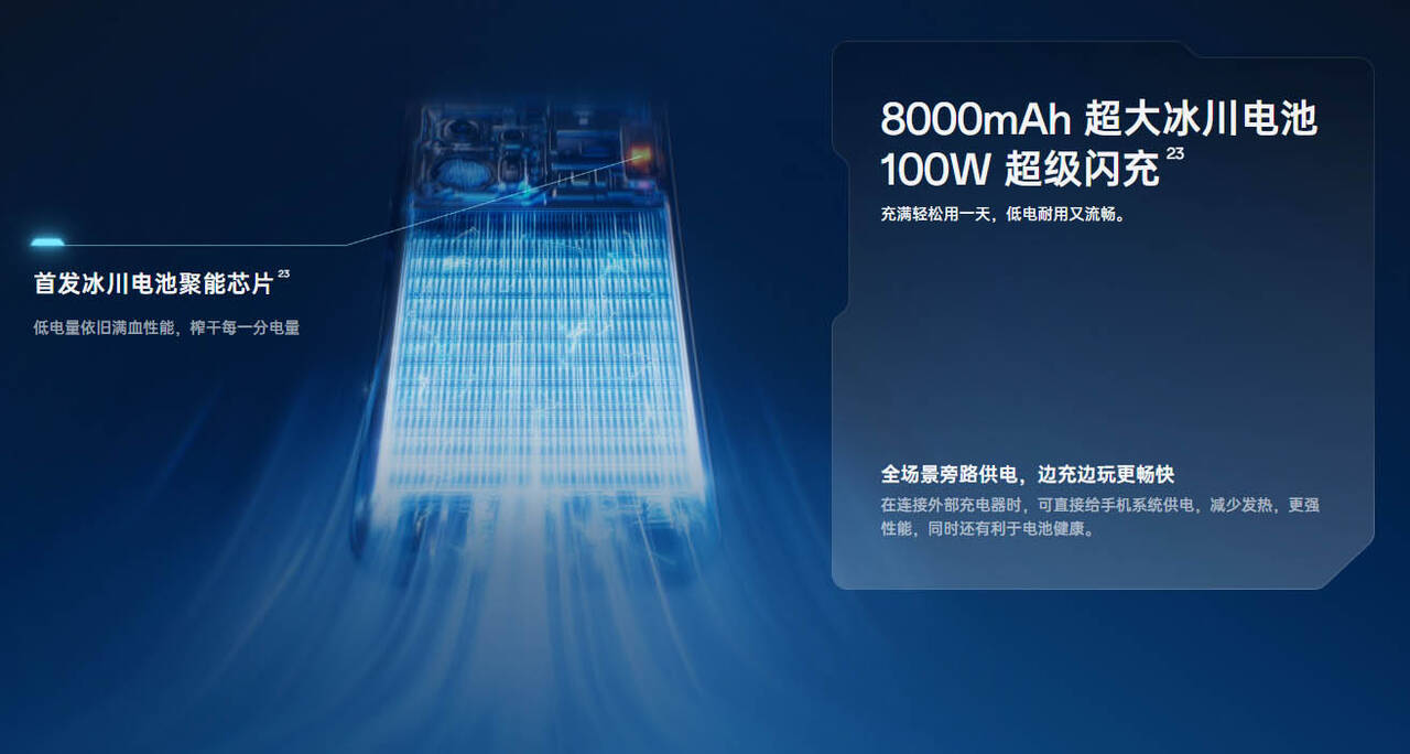 ▼バッテリー容量は8000mAh。急速充電は100W(SUPERVOOC)、55W(PPS)、44W(UFCS)に対応しています。↓