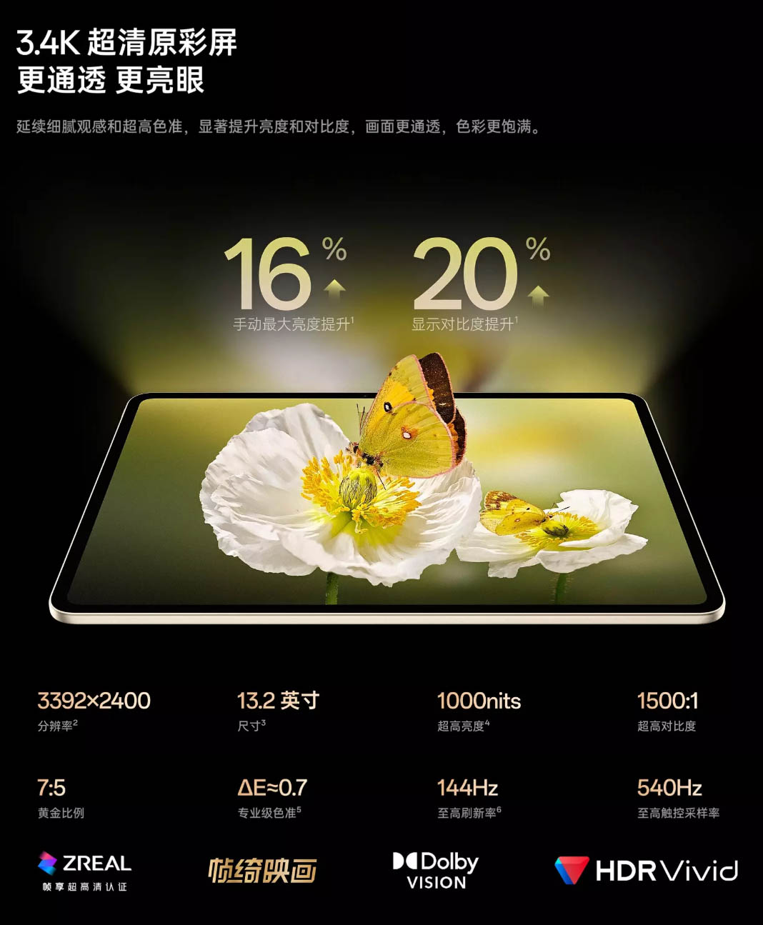 ▼ディスプレイは13.2インチの液晶で、解像度は3,392×2,400。リフレッシュレートは30~144Hzに対応しています。アスペクト比は7:5。従来の16:10のタブレットと比較して、電子書籍を閲覧したり、複数アプリを表示するのに向いています。↓