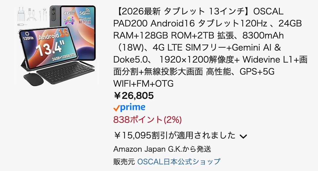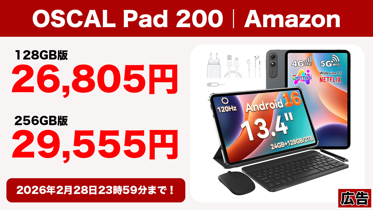 Blackview系列ブランドのOSCALがリリースする13.4型タブレット「OSCAL Pad 200」が大型割引を開始。なんと価格は26,805円と筆者の予想を上回る激安っぷり。付属品も豪華なのでプレゼント品としてもアリ。