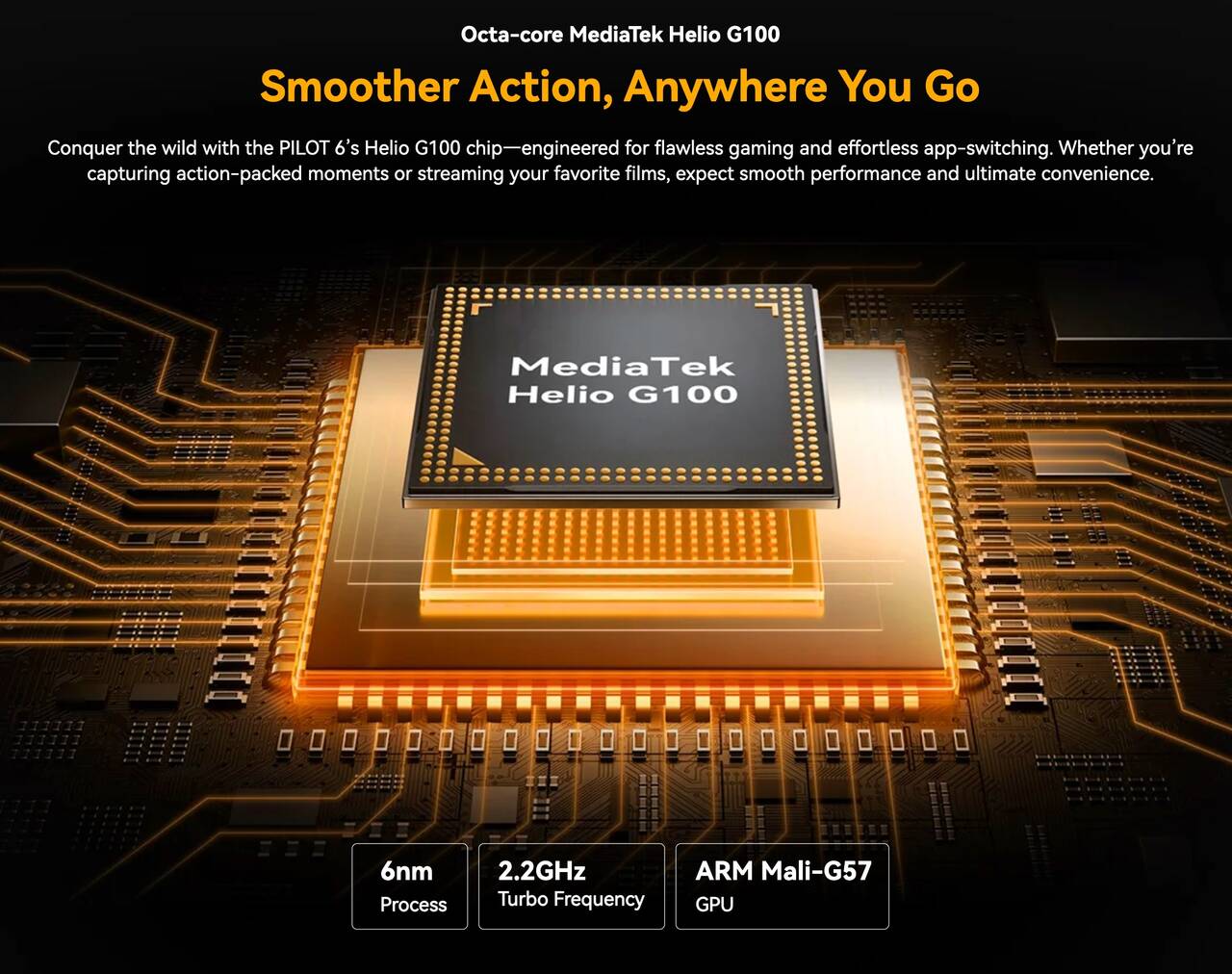 ▼OSCAL Pilot 6が搭載するSoCはMediaTek Helio G100、メモリは12GBでストレージは256GBを搭載。↓