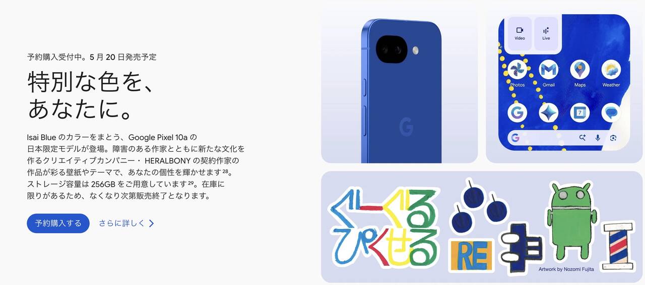 GoogleがPixel 10aの日本版を発表!発売日は2026年4月14日で価格は79,900円〜。今回は日本限定カラー「Isai Blue」も用意されていて、5月20日に発売とのことです!それではスペックをチェックしていきます。