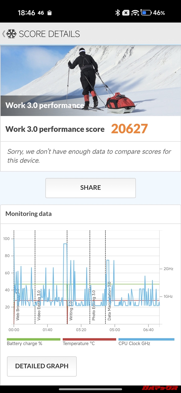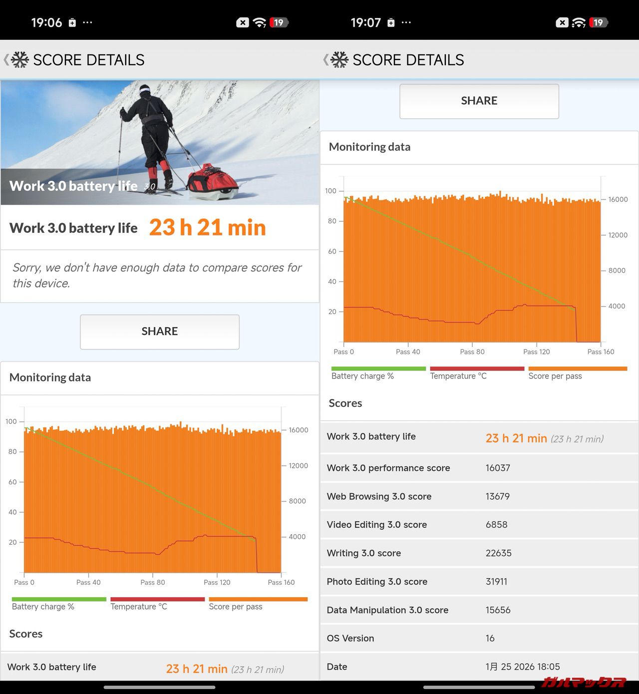 ▼PCMarkでのバッテリーテストはなんと23時間以上を記録。筆者が見てきたものはたいてい16~17時間が多かったんで、かなり良い水準だと思えます。↓