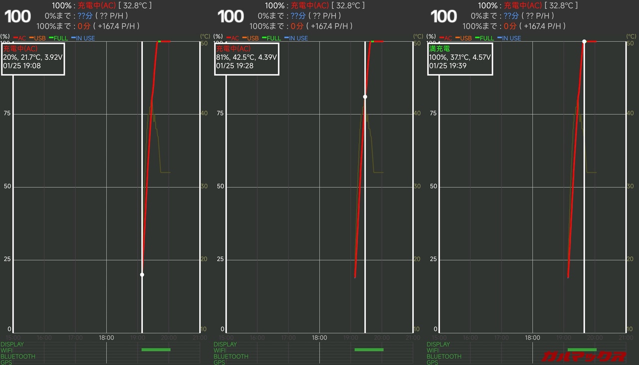 ▼付属の100W充電器とケーブルで充電。30分の充電で61%充電(20%→81%)、満充電まで31分。非常に速いです。↓