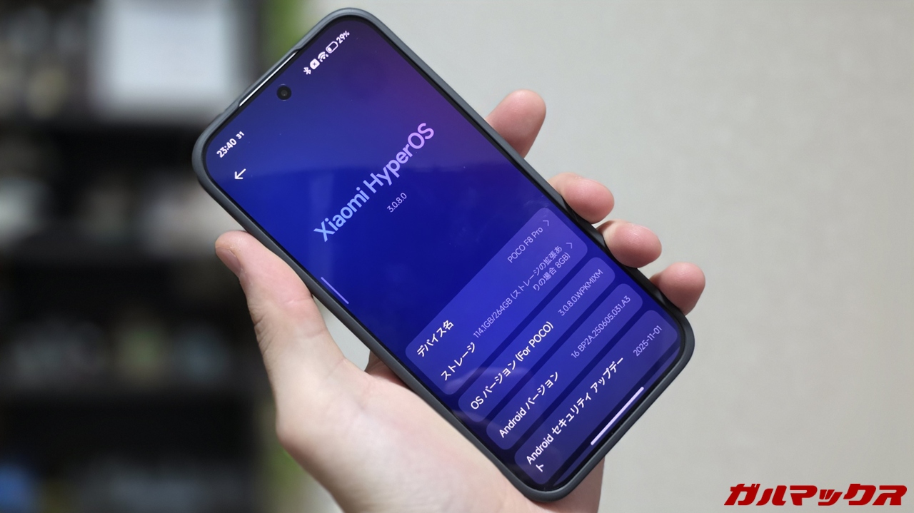 POCO F8 ProのソフトウェアはXiaomi独自OSのXiaomi HyperOSを内蔵。Androidベースバージョンは16。