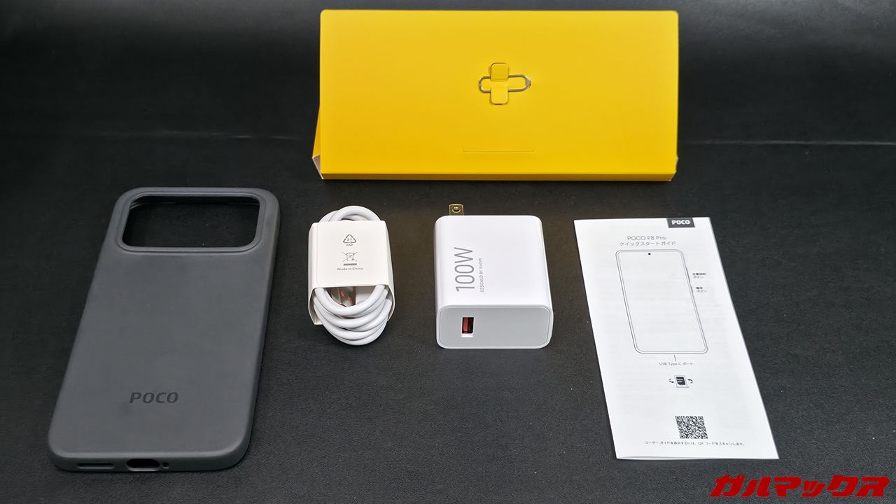 あと筆者が調べた限り、このPOCO F8 Proに付属する100W充電器が同梱されるのは日本では初だそうです。マジでありがたすぎる。充電器が同梱されないパターンがほとんどだし、あったとしてもフルスペックに対応するやつってそうそうなかったので‥