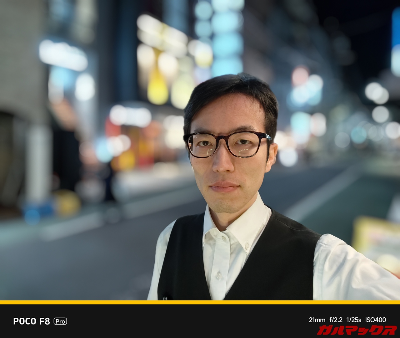 ▼夜景はポートレートで背景の照明も玉ボケ風味の撮影が可能。自撮りも同様。↓