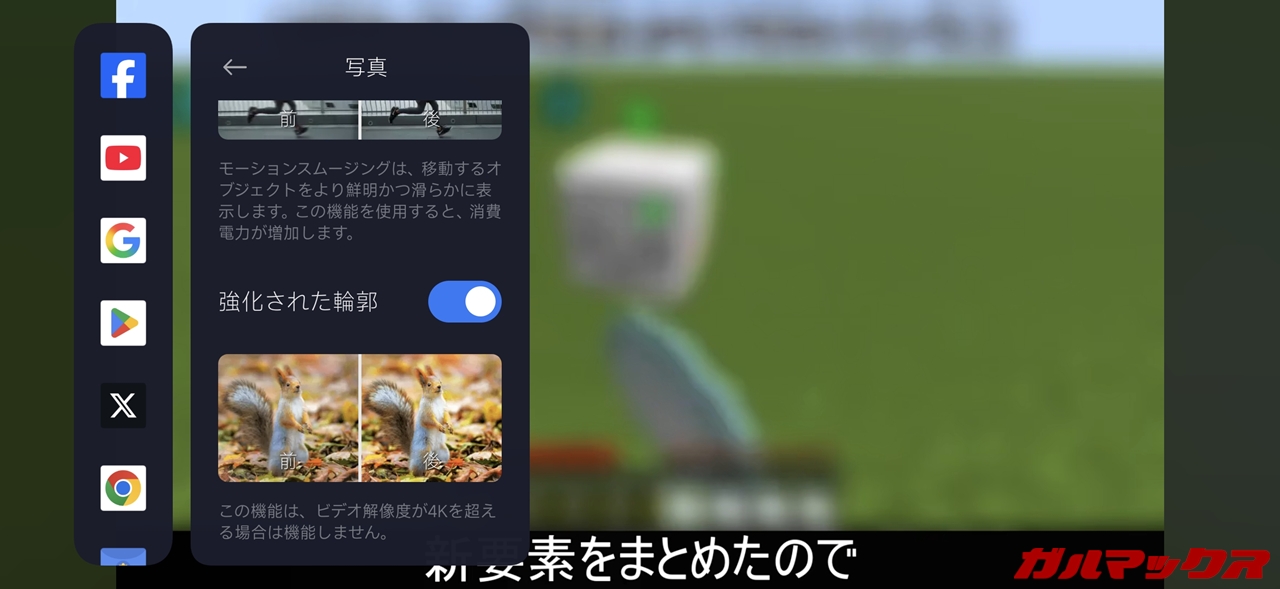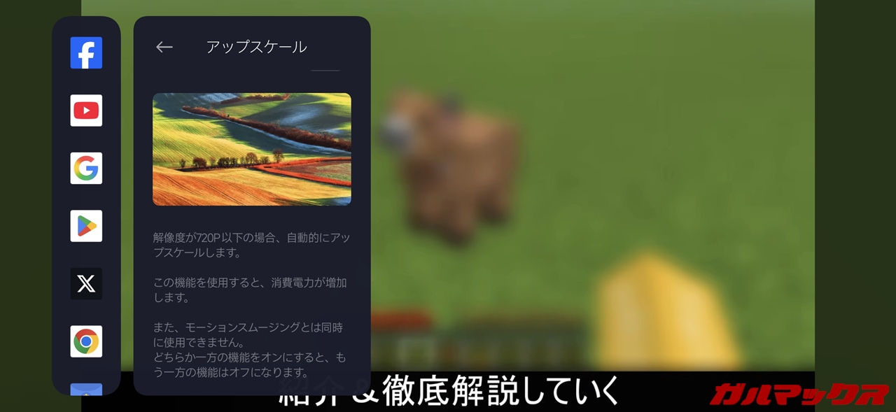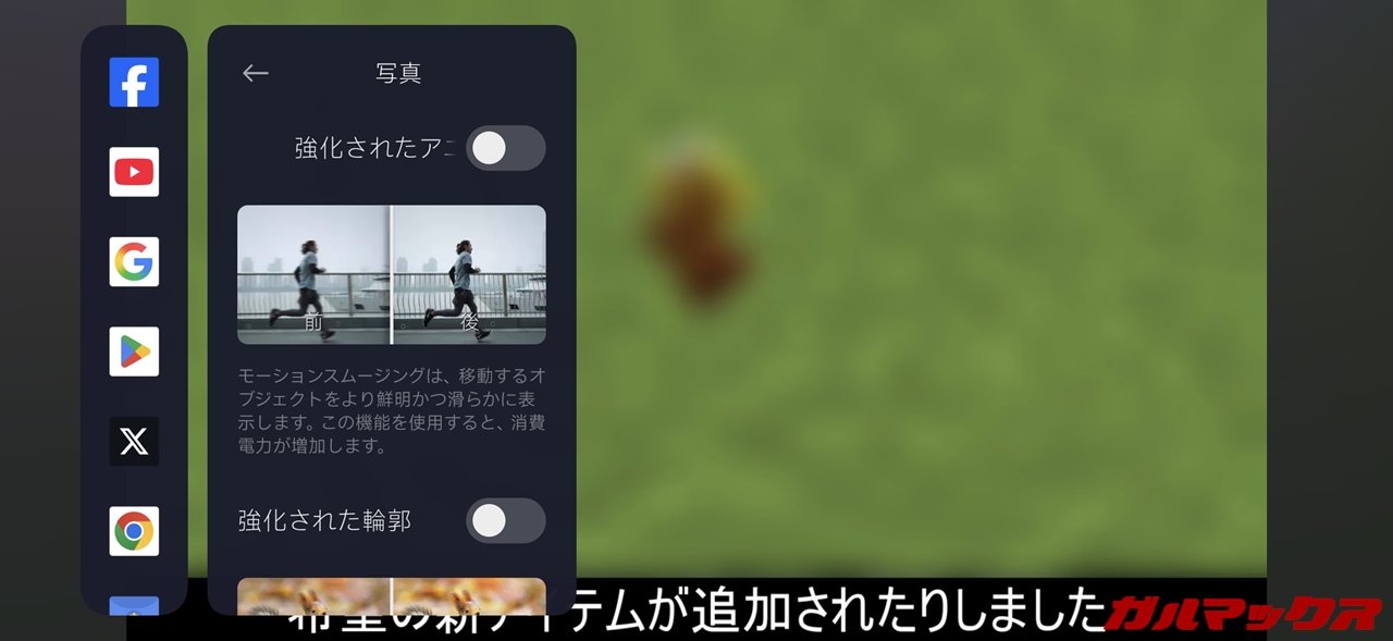▼ちなみにほかだと輪郭をくっきりさせたり、低解像度の動画を720p解像度にアップスケールする機能も対応しています。↓