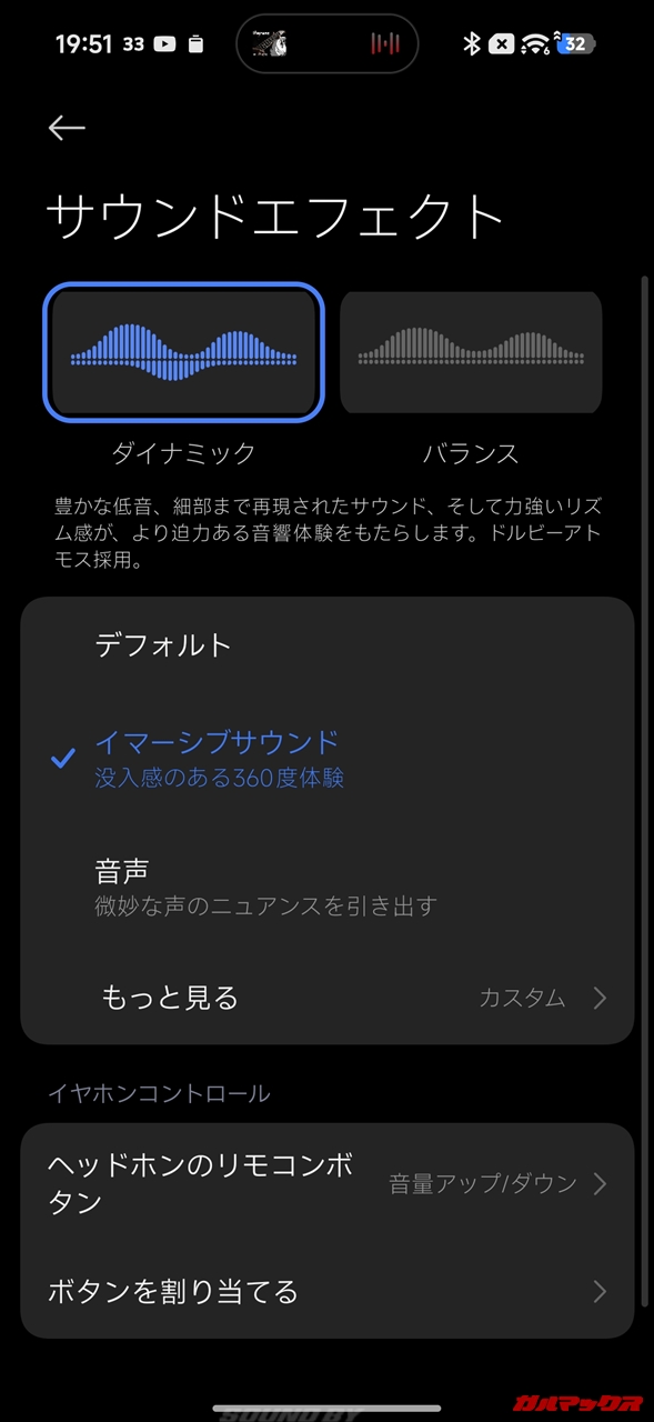 ▼なお、サウンドエフェクト設定でイマージブサウンドってのにしておくと、より効果は感じられます。↓