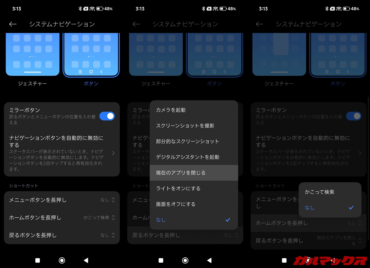 ▼ナビゲーションボタンはボタン自体にショートカットの機能を充てられるのも便利でオススメ。ただしホームボタン長押しはかこって検索しかあてられないので注意。昔はスクショとかにあてられたんだけどなあ(´・ω・`)。↓