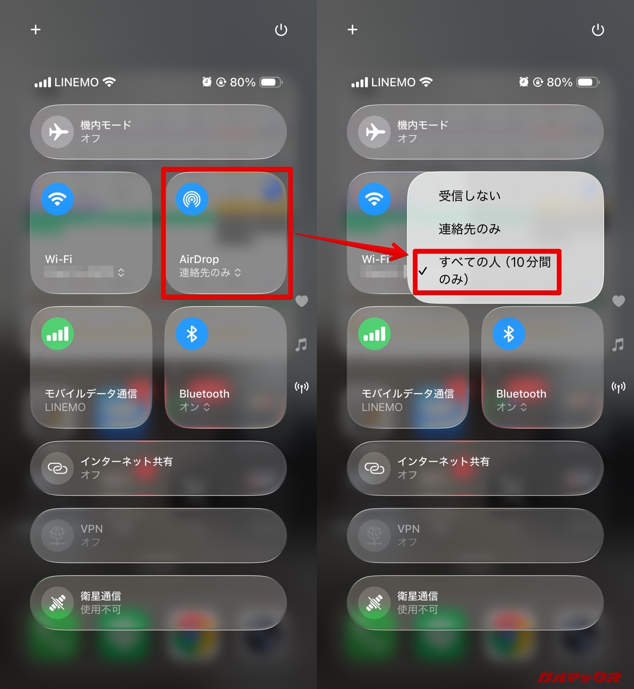 ▼続いてはiPhone。画面の右上からスワイプダウンして表示されるクイックメニュー画面を開き、更に上に2回スワイプすると以下の画面が表示されるので、AirDropの項目をタップして「すべての人(10分間)」に変更しましょう。↓